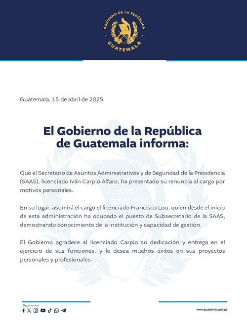 Tras la salida de Iván Carpio Alfaro, como titular de la Secretaría de Asuntos Administrativos y de Seguridad (SAAS), el Ejecutivo confirmó que fue juramentado José Francisco Lou, en dicho cargo.