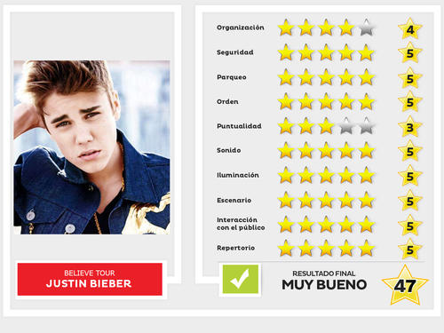 All Around The World fue la primera canción que interpretó el canadiense, de 19 años, mientras la adrenalina no se detuvo ni un instante a lo largo de la hora y media que duró la presentación, la cual no tuvo nada que envidiar de otras que se han dado en distintos países del mundo con el Believe Tour.