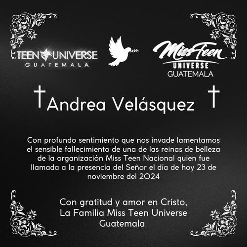 Mediante un comunicado en sus redes sociales, dieron a conocer que Andrea Velásquez, coronada como Teen Turismo Nacional Guatemala 2024, ha fallecido.