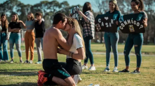 Desconcertado, miró a su alrededor y la vio a ella arrodillada, junto con tres amigas que mostraban una pancarta con la foto de ambos que decía "La Proupesta".