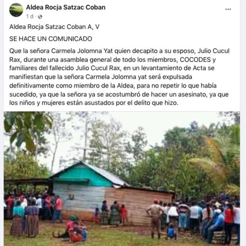 En su comunidad ya no la quieren, pues en una asamblea, la mayoría del pueblo dice haber acordado echarla. “Ya se acostumbró de hacer un asesinato”, dice un comunicado publicado en Facebook.