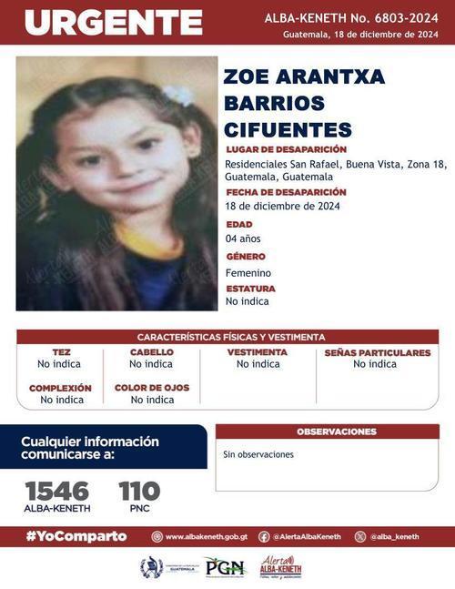 Mientras que Zoé Arantxa de 4 años, fue reportada como desaparecida en la misma fecha en Residenciales San Rafael, Buena Vista, zona 18.