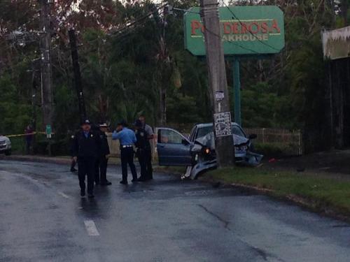 El auto de Feliciano, un Jaguar verde, cruzó al carril contrario y se estrelló contra un poste en la carretera PR-176 en Río Piedras, y su parte delantera quedó totalmente destruida por el impacto, según imágenes de la televisión local.