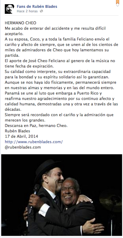 "El aporte de José Cheo Feliciano al género de la música no tiene fecha de expiración. Su calidad como intérprete, su extraordinaria capacidad para la bondad y su espíritu solidario así lo garantizan. Aunque se nos haya ido físicamente, permanecerá siempre en nuestras almas y memorias y en las del mundo entero", escribió el panameño Rubén Blades en su página de internet.