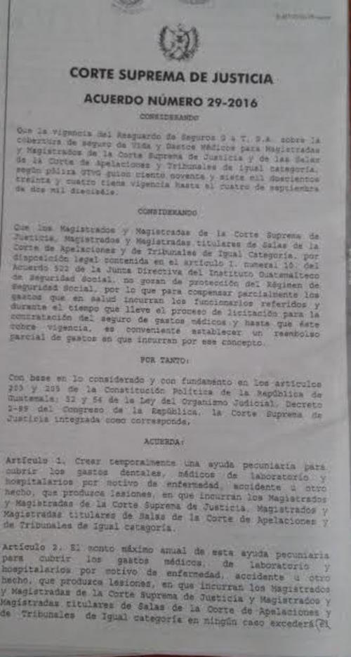 Este lunes fue publicado en el Diario Oficial el Acuerdo 29-2016 de la Corte Suprema de Justicia (CSJ) en el que se establece que los Magistrados de la CSJ, Salas de Apelaciones y Tribunales de igual categoría gozarán de ayuda económica de hasta tres sueldos para gastos de salud en los que puedan incurrir los funcionarios.