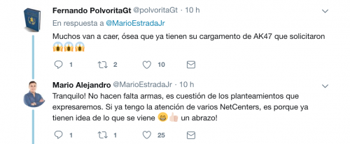Sin embargo, Estrada Ruano justificó que estaba siendo atacado por net center, y aseguró que no necesita de armas. "No hacen falta", dijo.