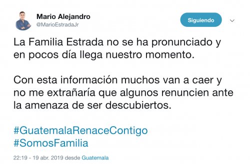 No obstante, el viernes por la noche, Estrada Ruano publicó un comentario en las redes sociales en las que amenaza con develar información con la que "muchos van a caer".