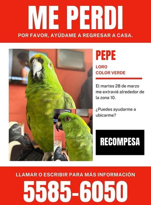 Cualquier información del loro "Pepe", puedes comunicarte al número 5585-6050.