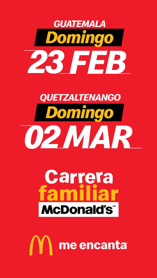 McDonald's anunció su icónica Carrera Familiar McDonald's edición 2025, un evento que se llevará a cabo en dos ciudades del país: la ciudad de Guatemala y Quetzaltenango. Este evento se realizará por décima vez en la capital y por tercera ocasión en la ciudad altense.