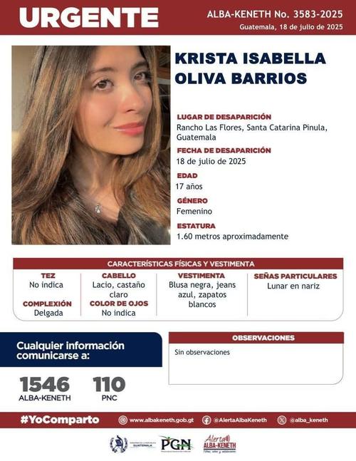 Krista Isabella Olivia Barrios desapareció desde el viernes 18 de julio.