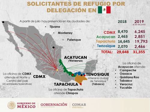 De acuerdo con un reporte de solicitudes de refugio en la Comisión Mexicana de Ayuda al Refugiado (COMAR) en lo que va del 2019 se han presentado 31 mil solicitudes, y la mayoría lo hace en Tapachula, Chiapas.