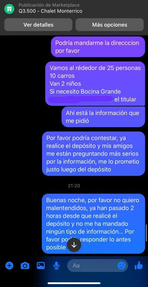 En ese sentido, él joven y sus amigos accedieron a cancelar la cantidad de Q2,500, pues la mujer les envió como "garantía" una fotografía de su Documento Personal de Identificación (DPI), sin imaginar que resultarían estafados, pues hacer el pago, Karla Maribel no volvió a responderles los mensajes y tampoco les proporcionó la ubicación del chalet.
