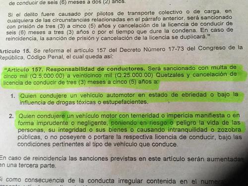 Los pilotos del servicio de transporte colectivo que sean sorprendidos conduciendo en estado de ebriedad o pongan en riesgo la vida de los pasajeros por su impericia y negligencia, serán sancionados con una multa de entre 5 mil a 25 mil quetzales, además de la cancelación de la licencia para conducir por 3 meses, hasta 5 años.