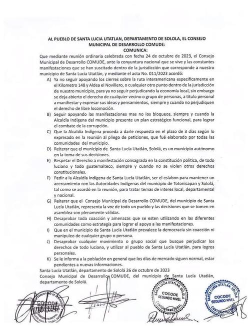 Mediante un acta difundida en redes sociales, el municipio de Santa Lucía Utatlán (Sololá) anunció que dejará de apoyar los bloqueos en la ruta Interamericana, en especial en el kilómetro 148, con el argumento de "no seguir perjudicando la economía local".