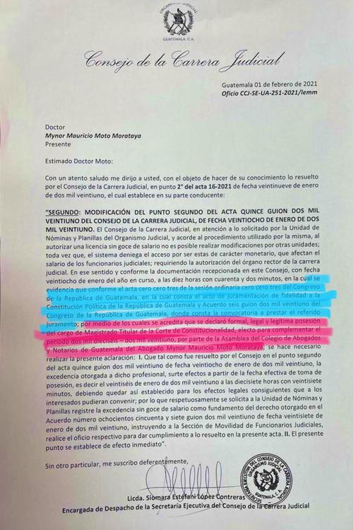 Esta es la carta que el Consejo de la Carrera Judicial emitió para Mynor Moto.