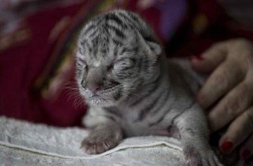 La pequeña "Nieve", como la llamaron, fue rechazada por su madre, pesó 954 gramos y es hija de dos tigres de Bengala de pelaje amarillo y negro.