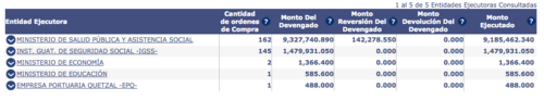 El monto total ejecutado del contrato, desde que fue renovado el 15 de agosto de 2015 a la fecha, es de 10 millones 667 mil 833 quetzales. El MSPAS ha sido la principal entidad ejecutora del mismo, habiendo realizado 162 compras por un valor de 9 millones 327 mil 740.