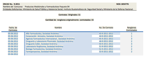 El documento más cercano a vencer es el de “Productos Medicinales y Farmacéuticos (2011) Paquete 4 DNCAE 09-2011”, cuya vigencia termina este jueves 14 de abril. En este se estipula que ocho proveedores abastecerán al Ministerio de Salud Pública y Asistencia Social (MSPAS), Instituto Guatemalteco de Seguridad Social (IGSS) y Ministerio de la Defensa Nacional (Mindef) con Vitaminas, Laxantes, Soluciones intravenosas y antisépticos, entre otros.