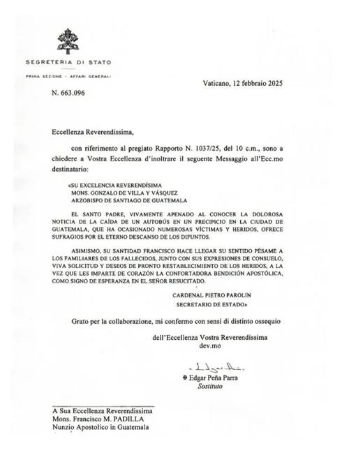 "El santo padre, papa Francisco, vivamente apenado al conocer la dolorosa noticia de la caída de un autobús en un precipicio en la Ciudad de Guatemala que ha ocasionado numerosas víctimas mortales y heridos, ofrece sufragios por el eterno descanso de los difuntos", leyó Francisco Montecillo Padilla, actual representante de la Santa Sede del Vaticano en Guatemala.