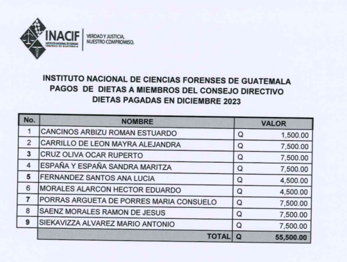 Según la información pública del Inacif, en diciembre de 2023, esta entidad pagó Q55,500 en dietas a nueve integrantes del Consejo. Porras, por ejemplo, recibió Q7,500. En otros meses, ha recibido Q1,500 o Q4,000, aunque el informe no detalla la cantidad de reuniones que atendieron ni los resultados de las mismas.