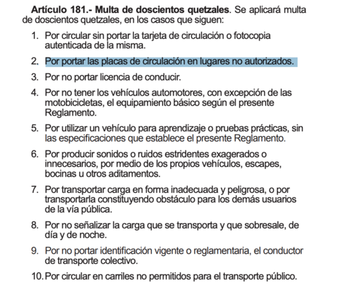 "Por portar las placas de circulación en lugares no autorizados se aplicará una multa de Q200", establece el artículo 181.