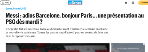 Le Parisien tituló la nota diciendo: "Messi: adiós Barcelona, hola Paris… ¿Una presentación al PSG el martes?", agregando que el argentino se despide del "Barça" este domingo antes de comenzar su nueva vida parisina la semana que viene. Todas las partes acuerdan un contrato de dos años en la capital francesa, puntualiza dicho medio informativo.