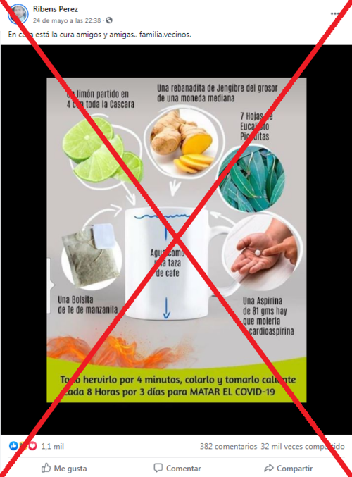 “En casa está la cura amigos y amigas… familia.vecinos”, dice una publicación de Facebook junto a una imagen que contiene una presunta cura para la Covid-19 y que ha sido compartida más de 32,500 veces.