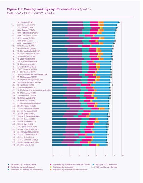 Los países se clasifican en términos de felicidad según sus evaluaciones de vida promedio durante los tres años anteriores, en este caso, de 2022 a 2024.