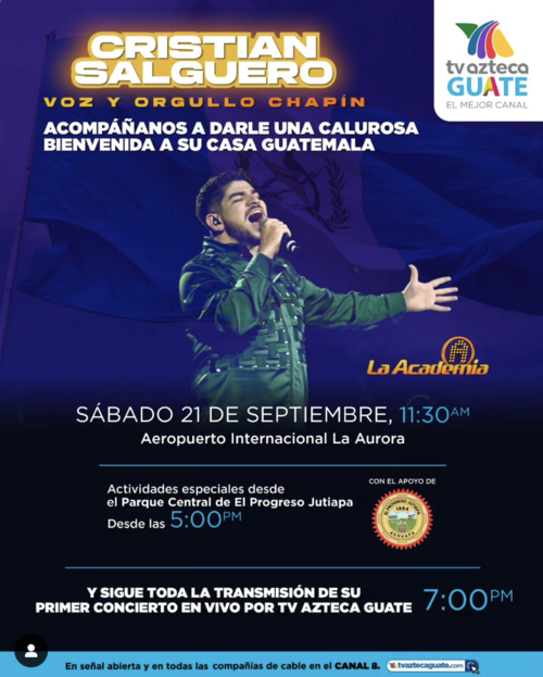 "Acompáñanos a darle una cálida bienvenida a nuestro querido chapín, Cristian Salguero, este sábado 21 de septiembre a las 11:30 AM en el Aeropuerto Internacional La Aurora", escribieron.