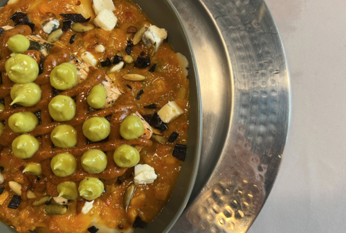 Una de ellas es "Mixco Viejo", que consiste en aromáticos y ravioles rellenos de puré de güicoy (calabaza Maya) amalgamados con una salsa de flor de calabaza y maíz silvestre con chispas de queso roquefort coronados con filete de salmón y carbón de chile guaque.