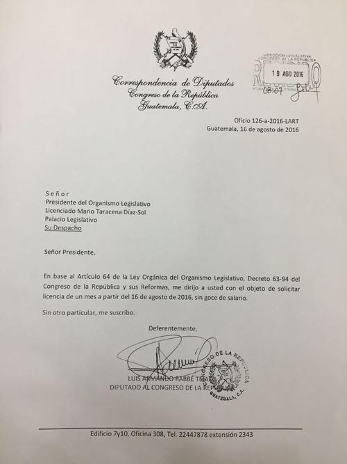 Rabbé no se presenta a trabajar desde el pasado jueves. Este martes salió del país rumbo a México, con lo que evitó que un juzgado lo arraigara. El Presidente del Congreso, Mario Taracena, señaló que no piensa darle permiso a Rabbé para ausentarse, pero esto deberá decidirse en la sesión de la Junta Directiva del próximo lunes.