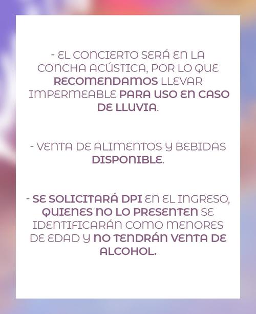 - El concierto será en la concha acústica, por lo que se recomienda llevar para uso en el caso que llueva.