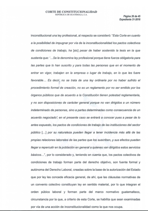 La resolución de la Corte de Constitucionalidad (CC) que declaró ilegal el pago de honorarios al abogado Landelino Franco, también confirmó que los pactos colectivos con entidades estatales pueden ser impugnados cuando exista confrontación entre el tema presupuestario y el derecho al trabajo.