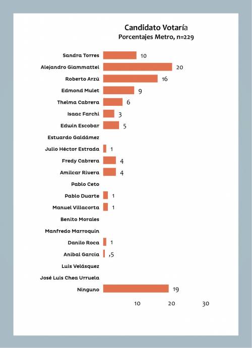 En el área metropolitana, Giammattei (20%) tiene el doble de intención de voto que Torres (10%); sin embargo, la candidata de la UNE lo aventaja ampliamente en el rubro "resto" (27% contra 8%), en el que se incluye el área rural.