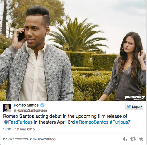 La séptima parte de la saga Rápido y Furioso llega en abril, pero al parecer no todas las noticias al respecto estaban dichas. Esto, porque el cantante de bachatas, Romeo Santos, publicó en su cuenta de Twitter una imagen, de su participación en el film.