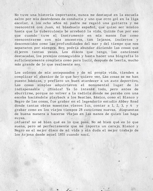 “¿Afuera? No sé bien qué es lo que pasa. No sé bien que es lo que suena, pero sé perfectamente que me importa un carajo. Blanco y Negro es el mejor disco de mi vida y sin duda el mejor trabajo de los Arjona desde aquel 1855 cuando nací”, concluye el documento.