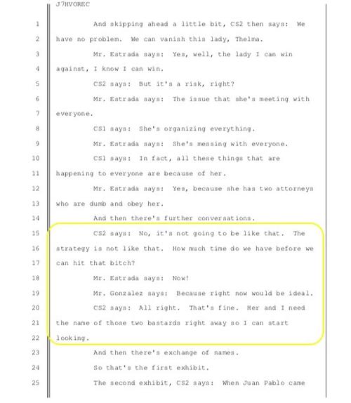 El documento que corresponde a la Corte de Estados Unidos detalla las conversaciones con el agente a quien se identifica como CS2. La plática es en relación a la planificación del atentado en contra de Thelma Aldana.