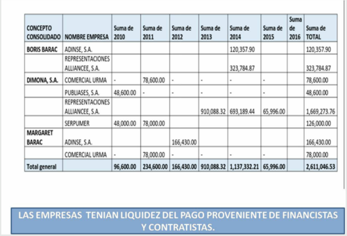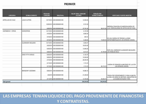 En resumen, desde diciembre de 2013 a marzo de 2015, Baldetti pagó con la misma tarjeta de crédito que era financiada por la empresa Proinver con recursos que le inyectaban contratistas del Estado y financistas del partido, un total de 218 mil 310 dólares.