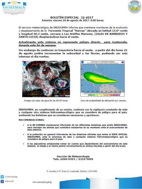 A partir de la próxima semana, las lluvias podrían incrementarse en parte del territorio nacional debido a la llegada de la tormenta tropical Harvey, según informó el Instituto Nacional de Sismología, Vulcanología, Meteorología e Hidrología (Insivumeh).