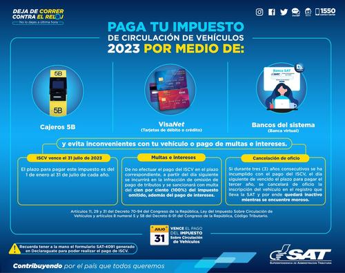 La Superintendencia de Administración Tributaria (SAT) dispone de tres formas para hacer efectivo el pago del impuesto de circulación: en cajeros automáticos, con débitos en Visanet o bien, en los bancos del sistema ya sea en las agencias físicas o virtuales.