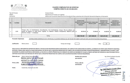 De acuerdo al portal Guatecompras, en la adjudicación cuatro empresas ofrecieron sus servicios pero dicho viceministerio se lo otorgó a la de la oferta más elevada: Distribuciones Generales Alfa. La empresa ya era contratista del Estado, pero en proyectos de construcción.