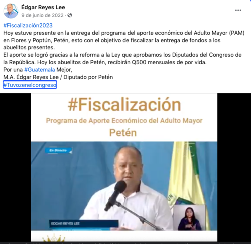 "El Programa del Adulto Mayor es uno de los más nobles del Estado, pues atiende a personas vulnerables y con necesidad. Este importante programa es administrado por el Organismo Ejecutivo. Como intermediarios de la población fuimos testigos de que los adultos mayores fueron una prioridad del gobierno anterior, como también lo fue de nuestra legislatura, pues en mi presidencia impulsamos y logramos la aprobación de un decreto de ley que incrementó de 400 a 500 quetzales en la pensión que se otorga a cada uno.