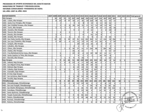 Otra fuente que trabajó para el Programa del Adulto Mayor del Ministerio de Trabajo explicó a Soy502 que anteriormente los pasos para incorporar a un adulto mayor eran: el interesado presentaba la solicitud, luego se asignaba un día para realizar el estudio socioeconómico por una trabajadora social, después el expediente pasaba al área jurídica para verificar requisitos y emitían el dictamen. Si la solicitud era favorable, se subía a nómina para efectuar el pago.