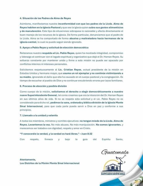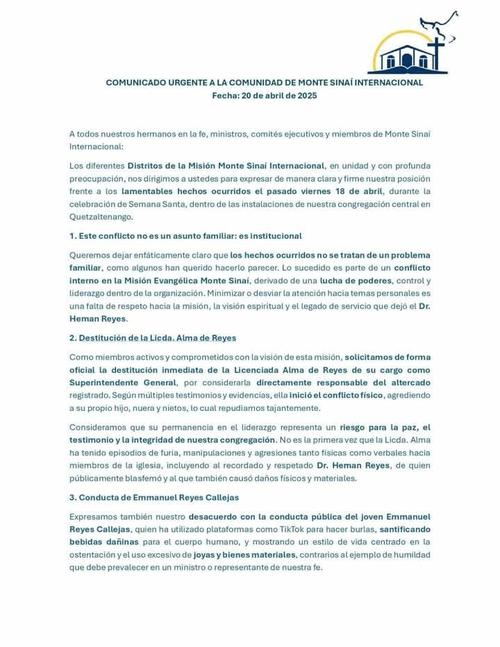 El pasado lunes de Pascua surgió un comunicado que presuntamente habría sido emitido por Los Distritos de la Misión Monte Sinaí Internacional. En el documento se abordan varios puntos, entre ellos que no se trató de un conflicto familiar, sino institucional.