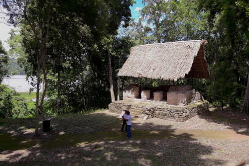 “Conseguimos un préstamo del Banco Interamericano de Desarrollo y la Rainforest Alliance para construir el centro de visitantes del parque”, comenta Buitrón. “Por eso Otto y Roxana (en referencia al exbinomio presidencial) vinieron aquí (a Yaxha) una vez a poner una placa y hacer como que por ellos lo habíamos conseguido”, cuenta. No niega la intención de la comunidad de ponerle algo enfrente para taparla.