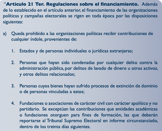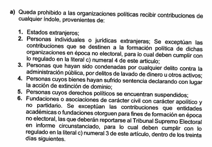 Tampoco se limita la recepción de fondos de personas con procesos de extinción de domino, solo prohibe cuando existe una sentencia, pero agrega que no pueden dar recursos aquellas personas que hayan sido suspendidas por algún proceso legal en su contra.