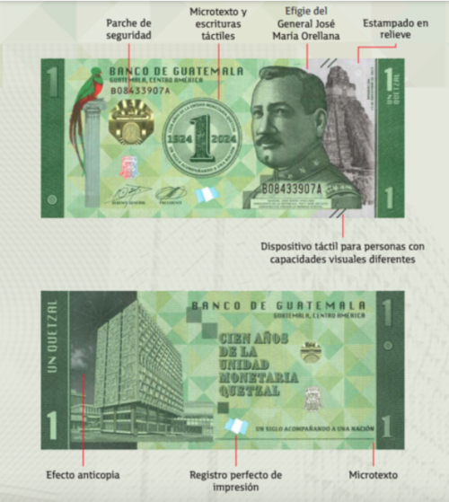 El billete conmemorativo de Q1 cuenta con medidas de seguridad para garantizar su validez; entre estas, un parche de seguridad, microtexto e impresión en alto relieve. También fue incluido un dispositivo para personas con discapacidad.