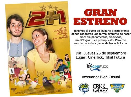 Una nueva propuesta en el cine guatemalteco nace este mes para la sana diversión familiar. Se trata de "2+1", el film que propone deshacerse del diálogo, para enfocarse en el lenguaje no verbal.