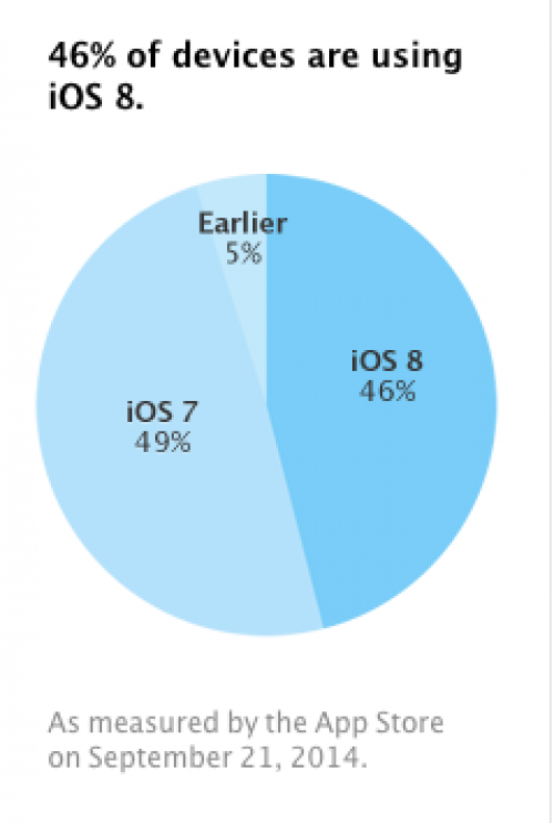 Según datos publicados en el blog oficial para desarrolladores de Apple, el 46 % de los iPhone y iPad de todo el mundo ya funcionan con iOS 8, mientras que un 49 % todavía lo hacen con su predecesor, el iOS 7, y el 5 % restante operan con sistemas operativos aún más antiguos.