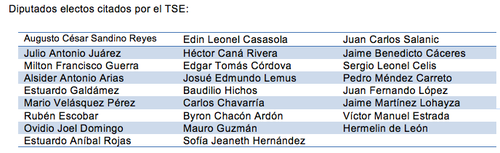 El TSE citó a 27 diputados electos para audiencias para decidir su caso, de este listado saldrían quienes quedarían fuera del parlamento. A esta lista, se suma los nombres de las personas, al menos 15, que han sido denunciadas por diversas organizaciones civiles. Este es el listado de los diputados electos denunciados por la sociedad civil: